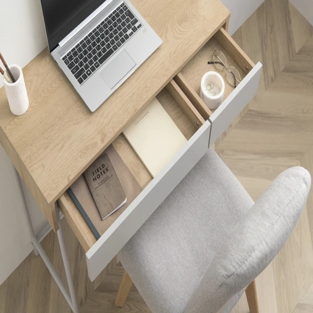 部屋を広く魅せるコンパクトなサイズのリビングデスクです。引き出しはグレーの化粧紙でアクセントをプラスし、木目調の板はインテリアに馴染みあたたかな雰囲気を演出します。天板は熱、水、傷に強いメラミン樹脂を使用しています。