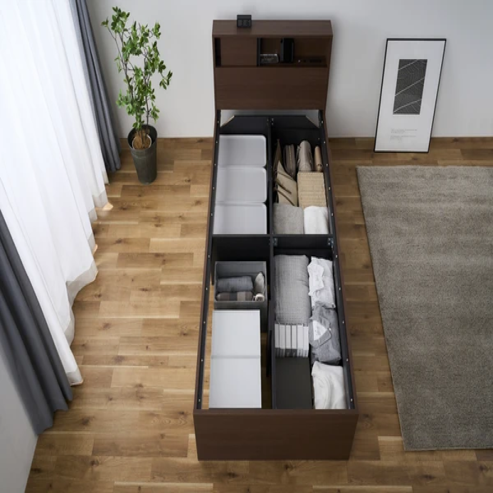 大容量のベッド下収納にこだわったヘッドボード付きのベッドです。ヘッドボードはスライド扉を採用し、インテリアを損なわないようにすっきり収納することができます。スライド扉横のオープンスペースは、手元を照らすLEDライトと2口コンセント付きです。ヘッドボード天板には時計やティッシュなどの小物が置けます